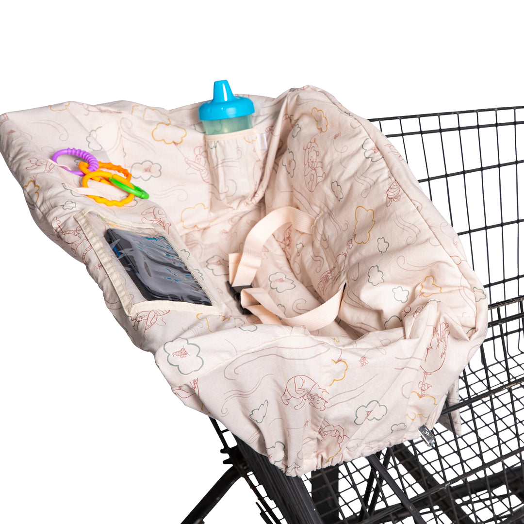 The Disney Baby Shopping Cart and High Chair Cover protects your child from dirt and more when in a shopping cart or restaurant style high chair. The cover's extra-large size fits ALL shopping carts and restaurant high chairs with a shower-cap style construction. Attach your child's favorite toys to two toy loops or use the clear cell-phone pocket to keep them entertained. An interior, elastic bottle pocket keeps milk or other drinks within reach. The cover features a comfortable, padded seating area and built-in buckle to help secure child in seat. Stuff the cover into the attached zipper pouch when not in use. When in use, the zipper pouch is perfect for holding wipes. Machine washable.