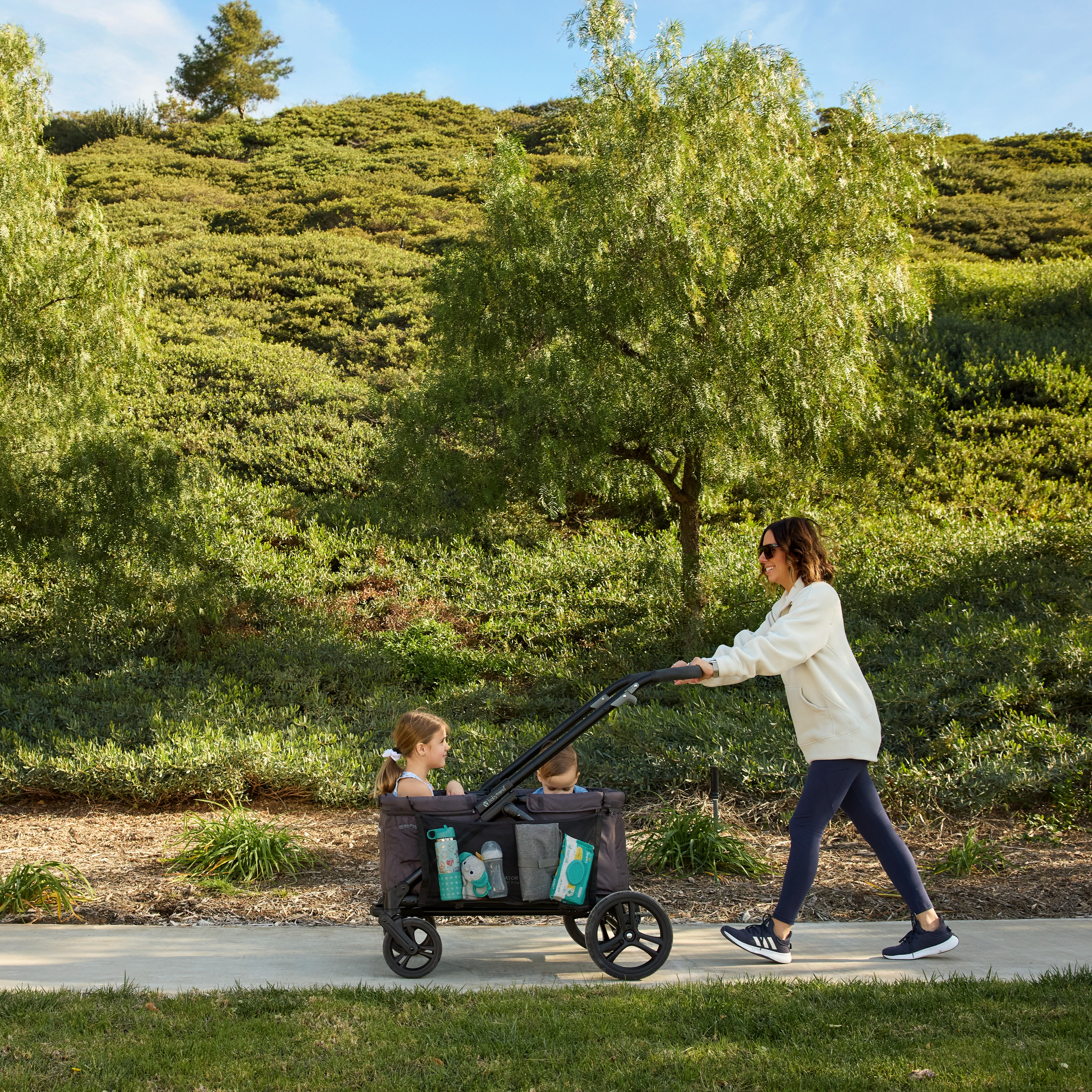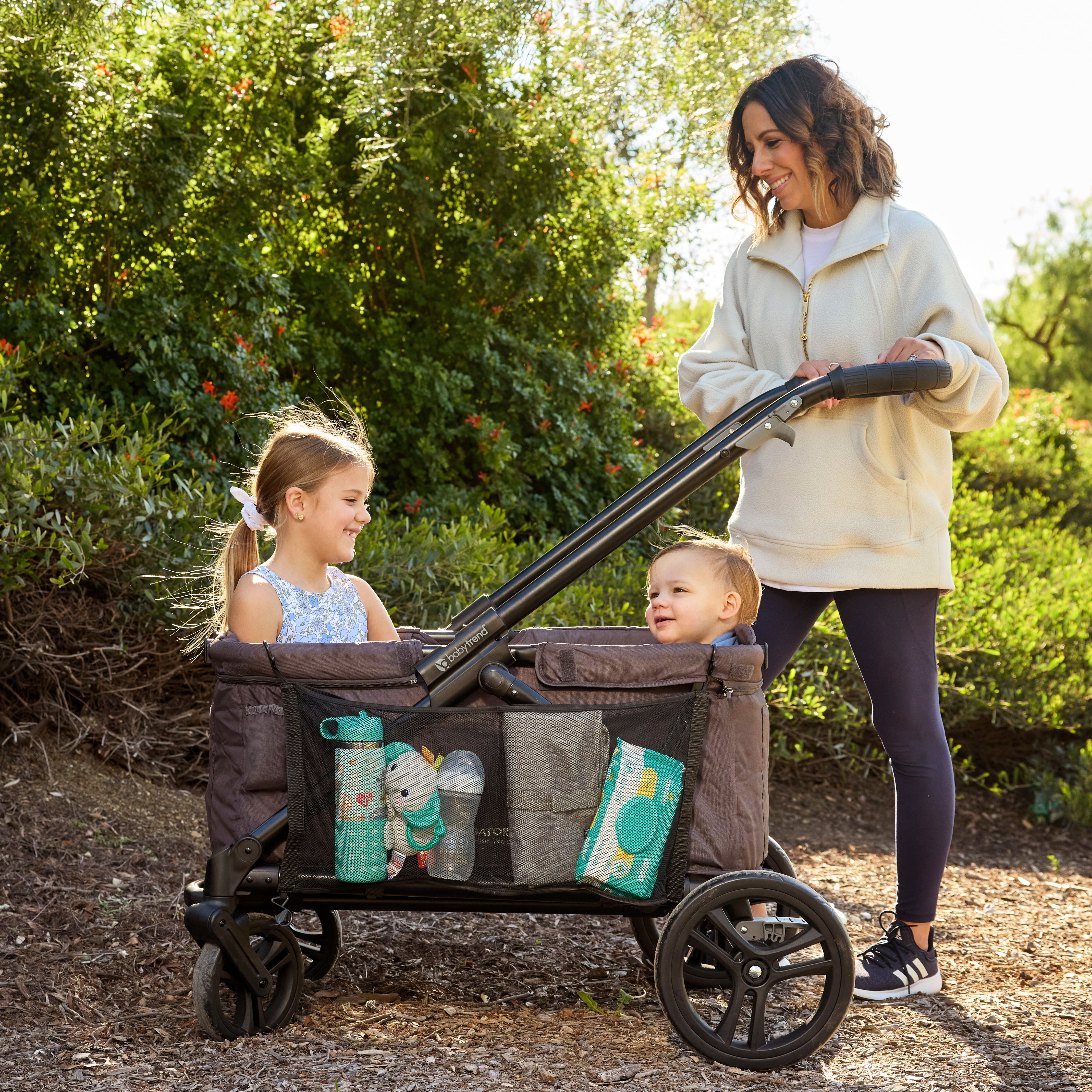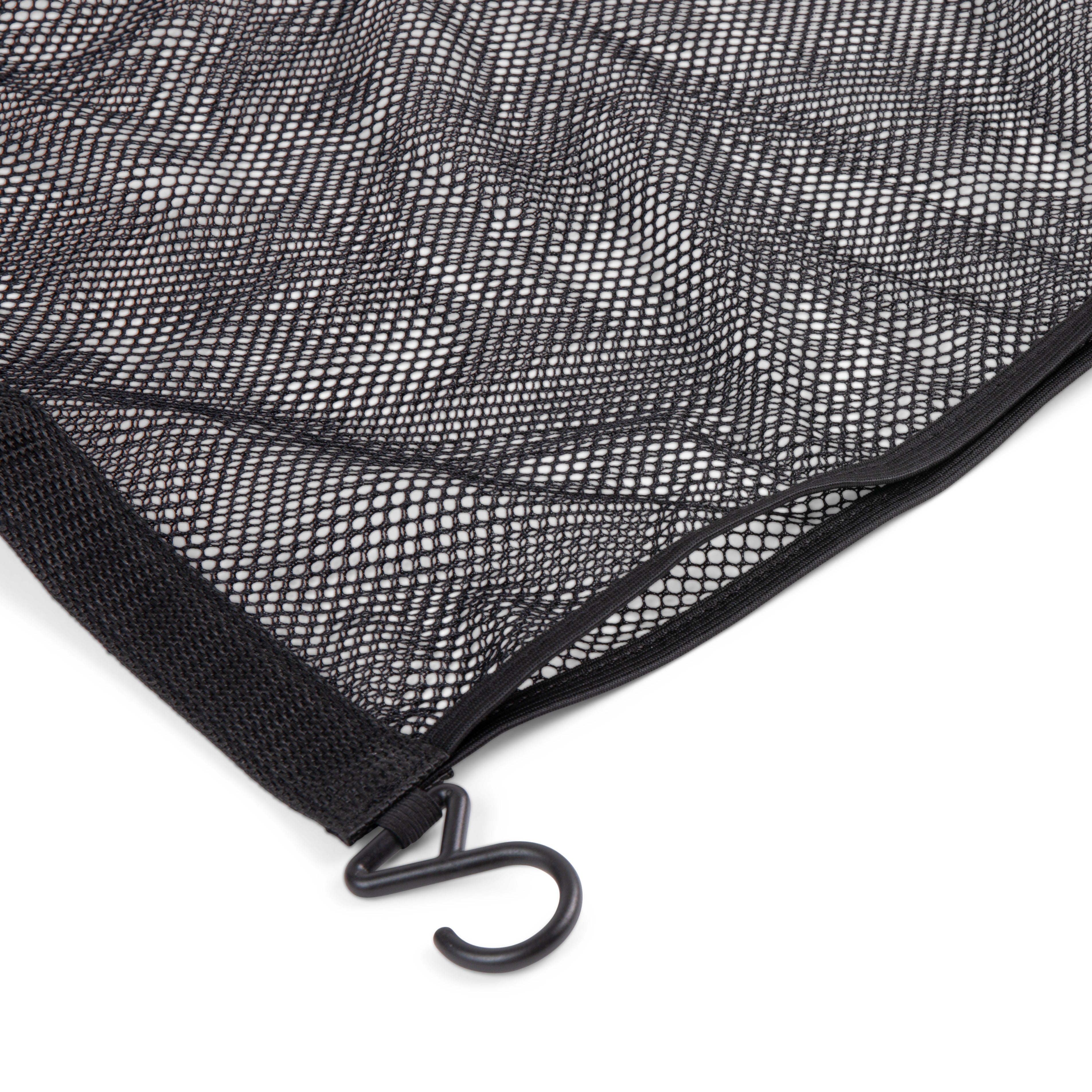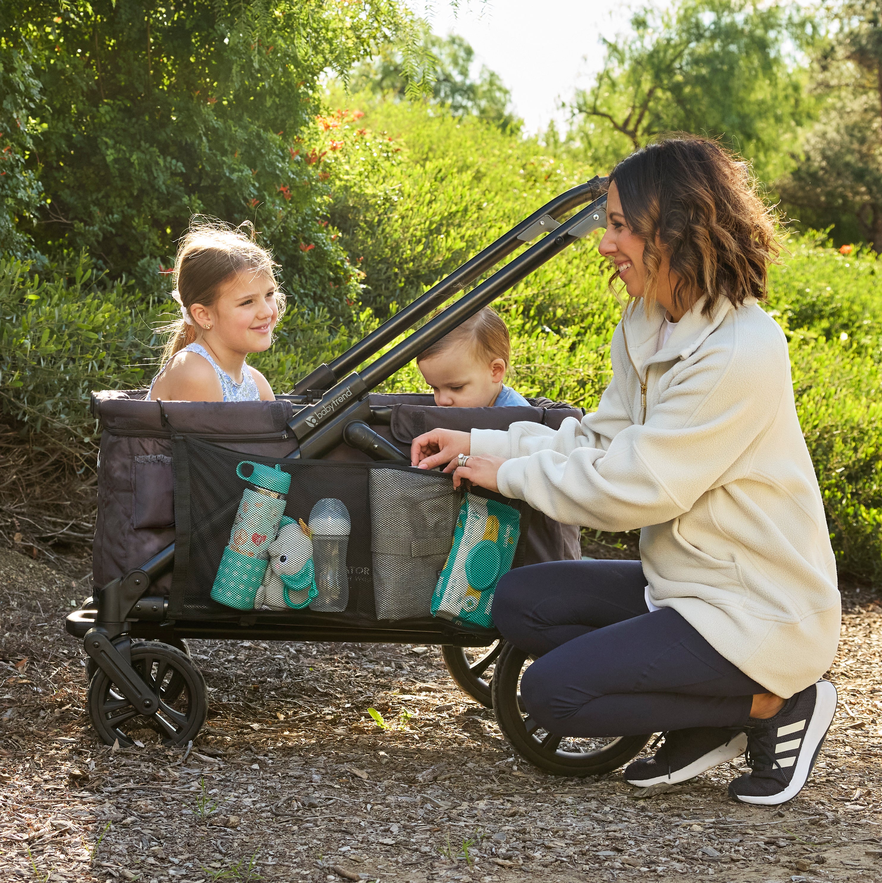 The J.L. Childress Stroller Wagon Organizer adds essenial, easy-access storage to all stroller wagons. This large 26"W x 12"H organizer is divided into four storage pockets: 2 small pockets, 1 medium pocket and 1 large mesh pocket. The Stroller Wagon Organizer stretches to attach to all stroller wagons with five adjustable hooks and holds all your family's on-the-go accessories. The durable, high-quality fabric withstands daily use and the large, elastic openings make it easy to put in and take out snacks, toys and more.
