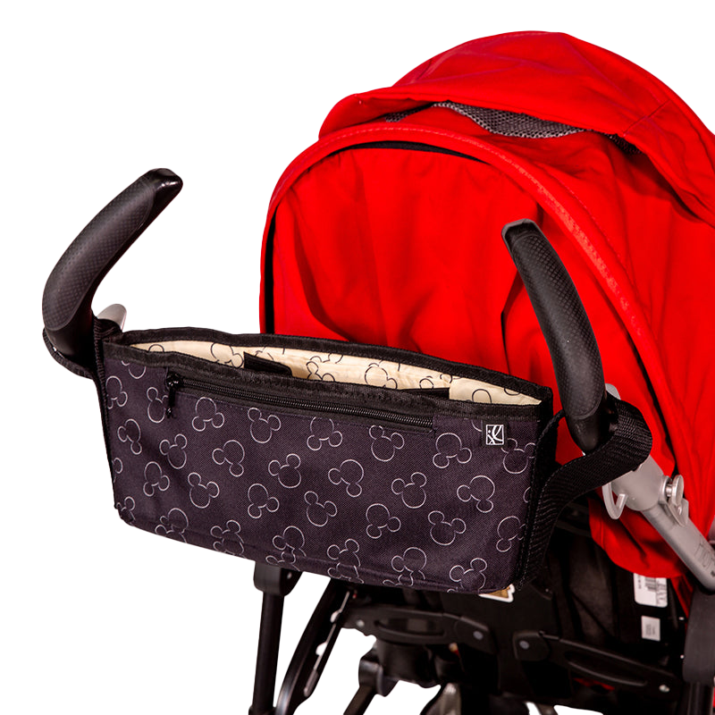 The Disney Baby Universal Stroller Organizer features 2 insulated drink holders, an easy-access center compartment, additional flat pocket and a front, zippered pocket for valuables. The Velcro straps on each side of the tray easily & securely attach to ALL stroller styles (and bicycles and wheelchairs too!). The organizer’s high-density foam construction provides structure and the durability to be used for years and years. A subtle Mickey Mouse print adds a touch of Disney magic!