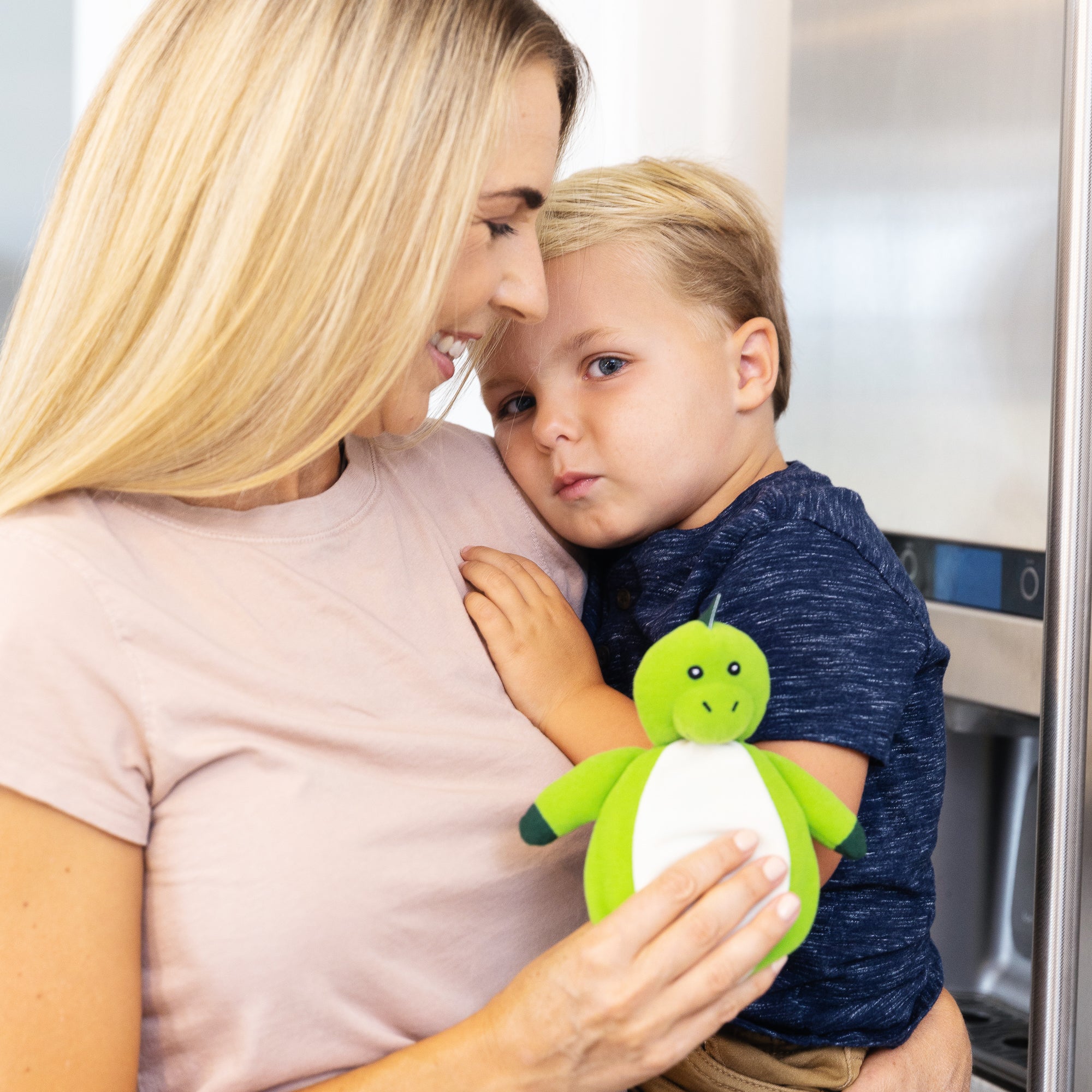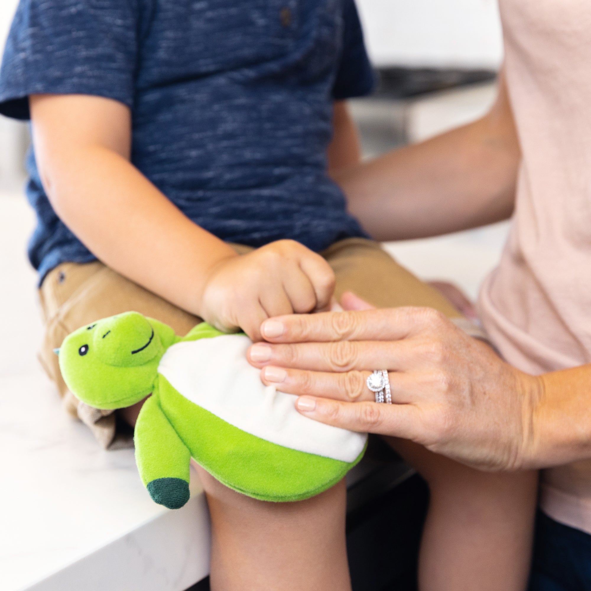 Adorable, plush animal friend that holds a removable, flexible ice pack to quickly treat any minor bump or bruise.